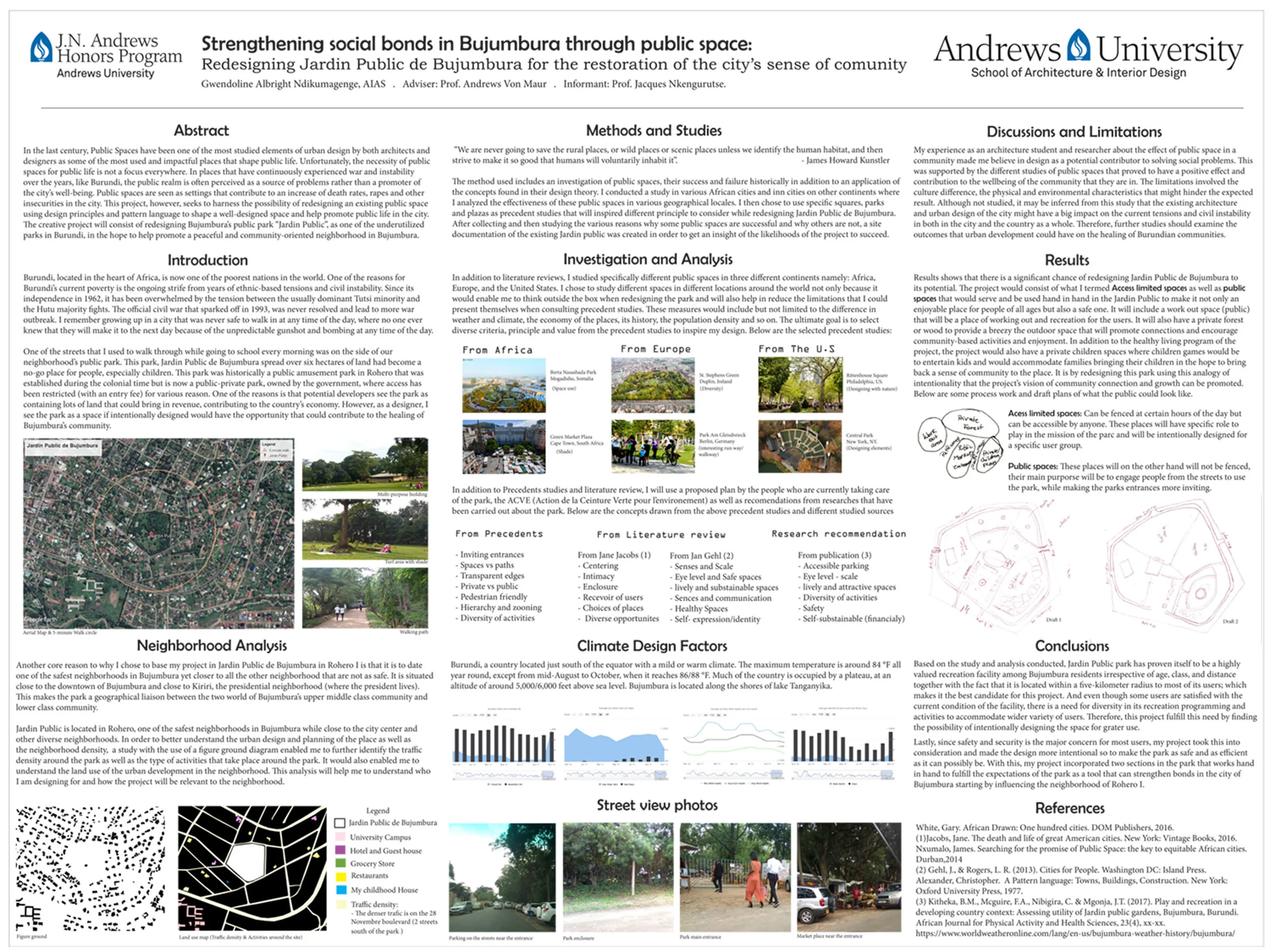 One of the most significant obstacles that I now consider an accomplishment was to conduct a research in both my home country (entitled: “Strengthening social bonds in Bujumbura through public space: Redesigning Jardin Public de Bujumbura for the restoration of the city’s sense of community.” and one on the campus (entitled Indoor-outdoor café) during my senior year. Both of these projects were assessing the way in which intentional urban spaces design can help heal, inspire, and promote better lives in communities. Both my advisors at the time: Professor Andrew Von Maur and Prof. Mark Moreno through sharing resources, guidance, and encouragement helped me overcome the obstacles that these projects brought up as a multicultural perspective was incorporated to truly find the possibilities for utilizing public places to bring change in people’s lives and communities.