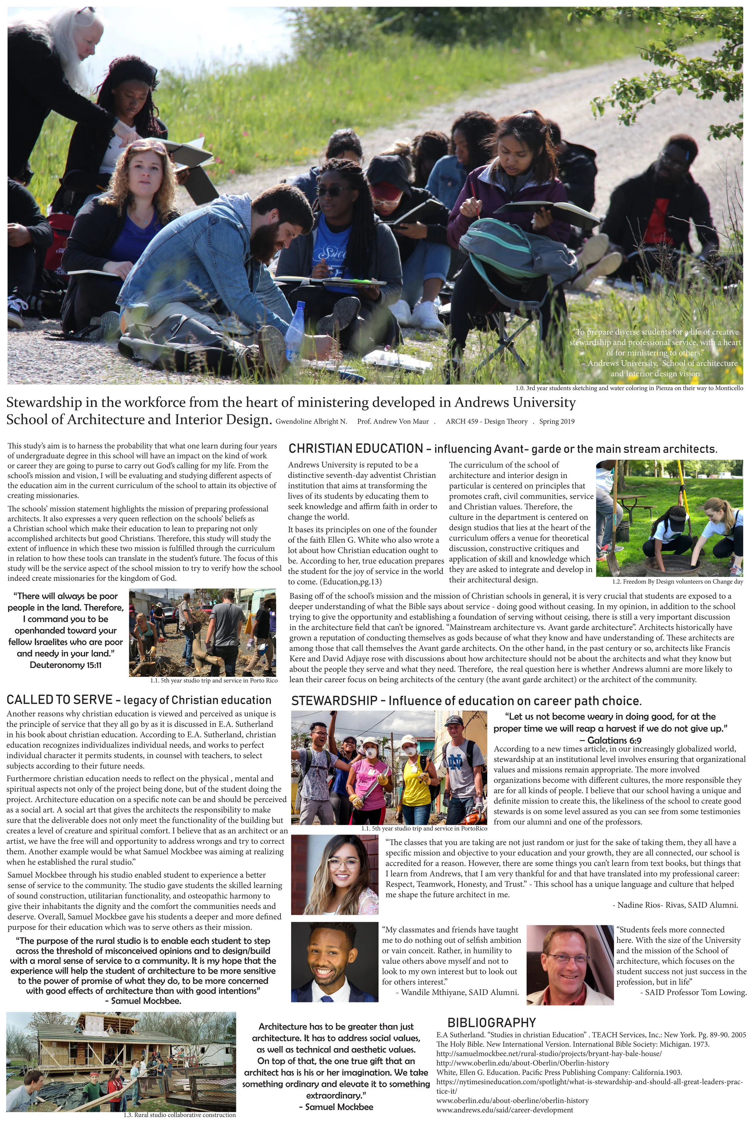 Gwendoline Albright N. is a recent graduate from Andrews University where she graduated with a M.Arch, B.Arch with honors, and a certificate in leadership. She is now working as an architectural designer at Heidi Hornaday, PC in New Buffalo, MI where she is able to gain architectural experience and exercise good stewardship of her degrees, gifts, skills, and talents in creating functional places that impact and inspire people to live better, healthier and happier. She is originally from Burundi and studied all her high school in Rwanda. She is a current associate member of the AIA and is actively pursuing licensure. In her college years, she served in many leadership positions and service projects locally and nationally through AIAS and was awarded the Alpha Rho Chi medal as the graduating student who showed an ability for leadership, performed willing service, and gives promise of real professional merit through her attitude and personality. Most of her work and volunteering involved initiating and implementing various community outreach projects, construction projects, and mentorship opportunities. Her everyday motivation and personal mission are to live a life of influence, impacting communities, and gradually change the world with a heart of service, stewardship, and ministering to others.